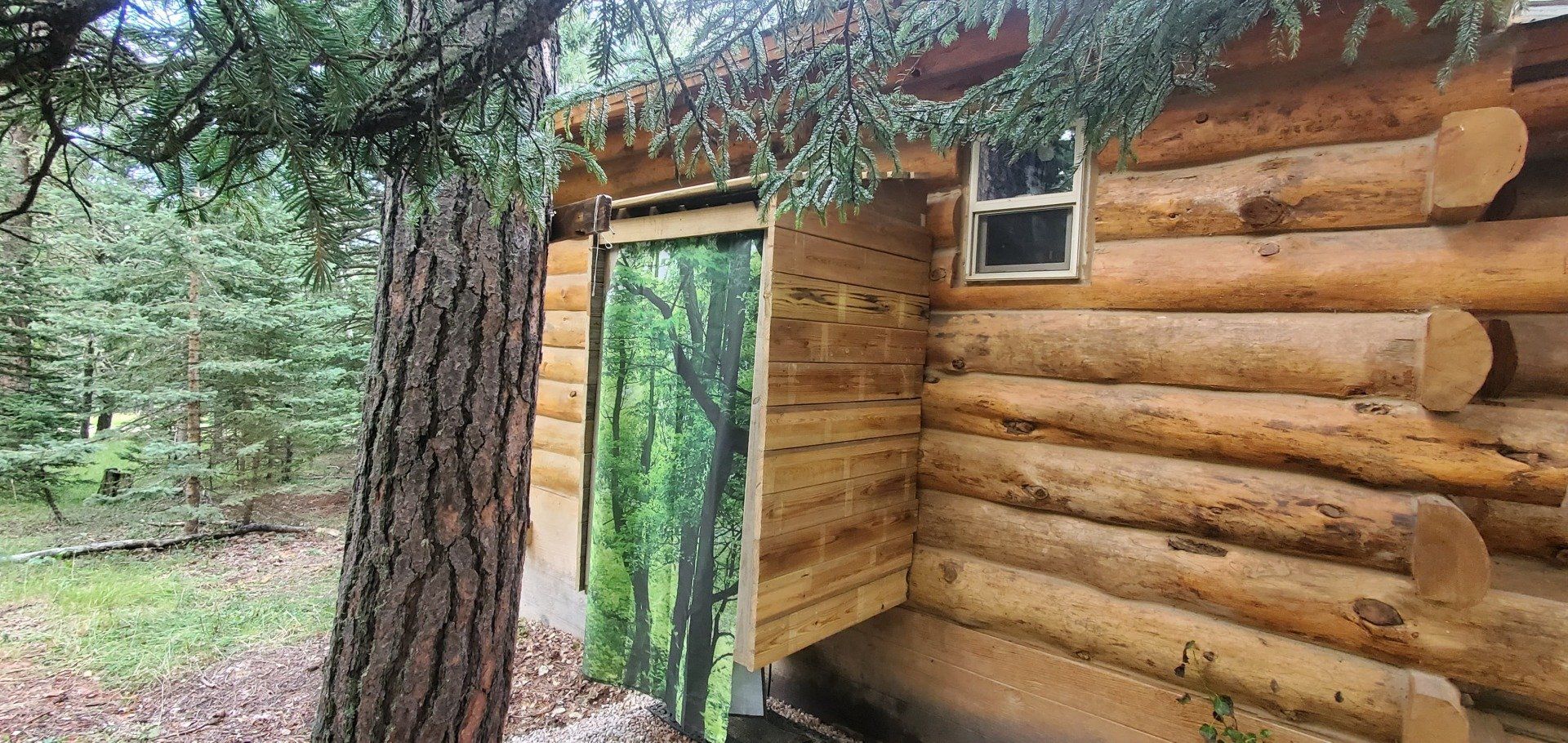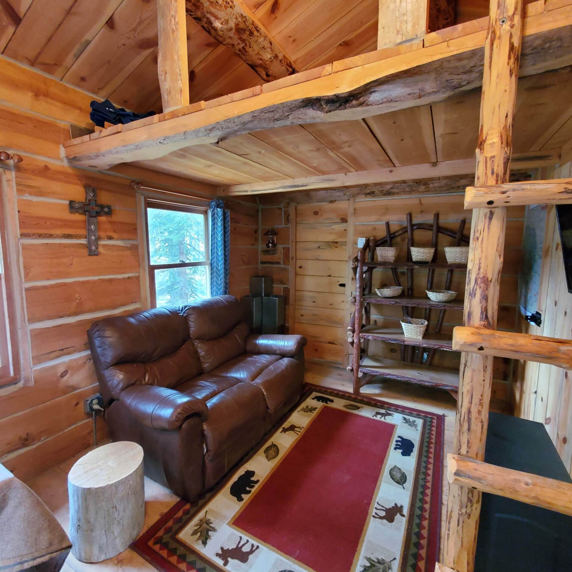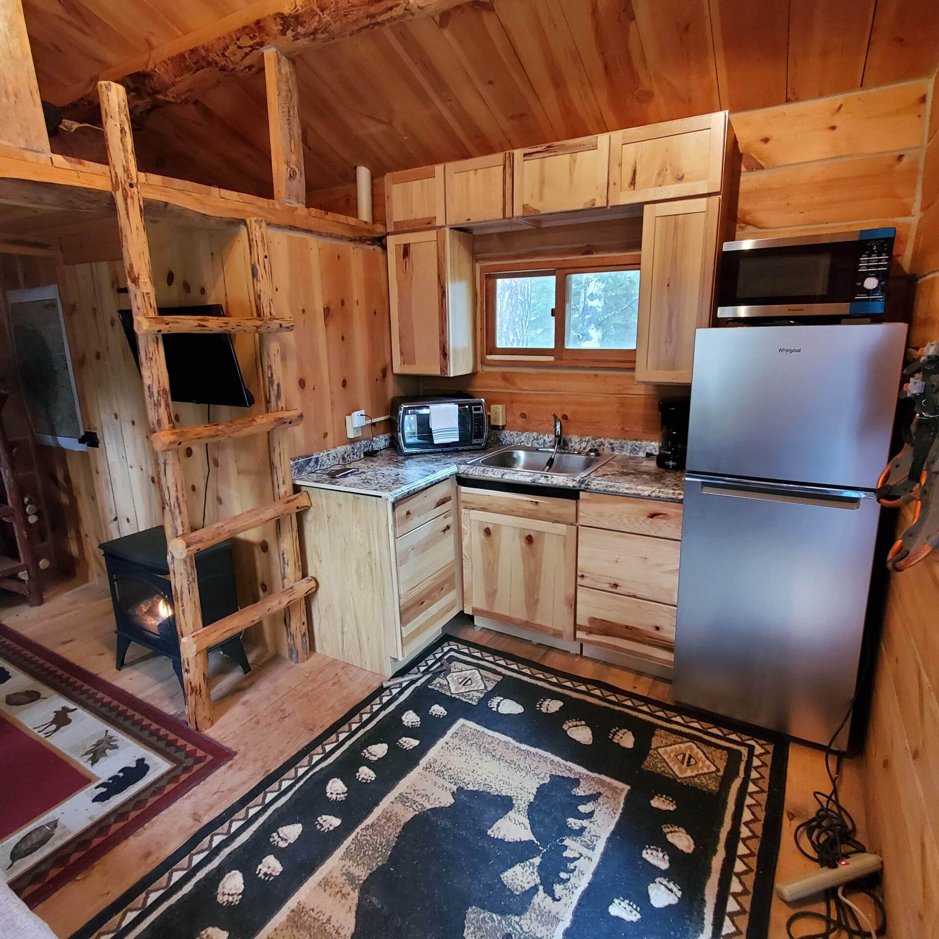 Our Cozy Cabin was born in Montana and raised in Deadwood. It features a small, but functional kitchen with hot and cold running water, a refrigerator, a small cook top, a microwave, coffee pot and counter-top oven.
