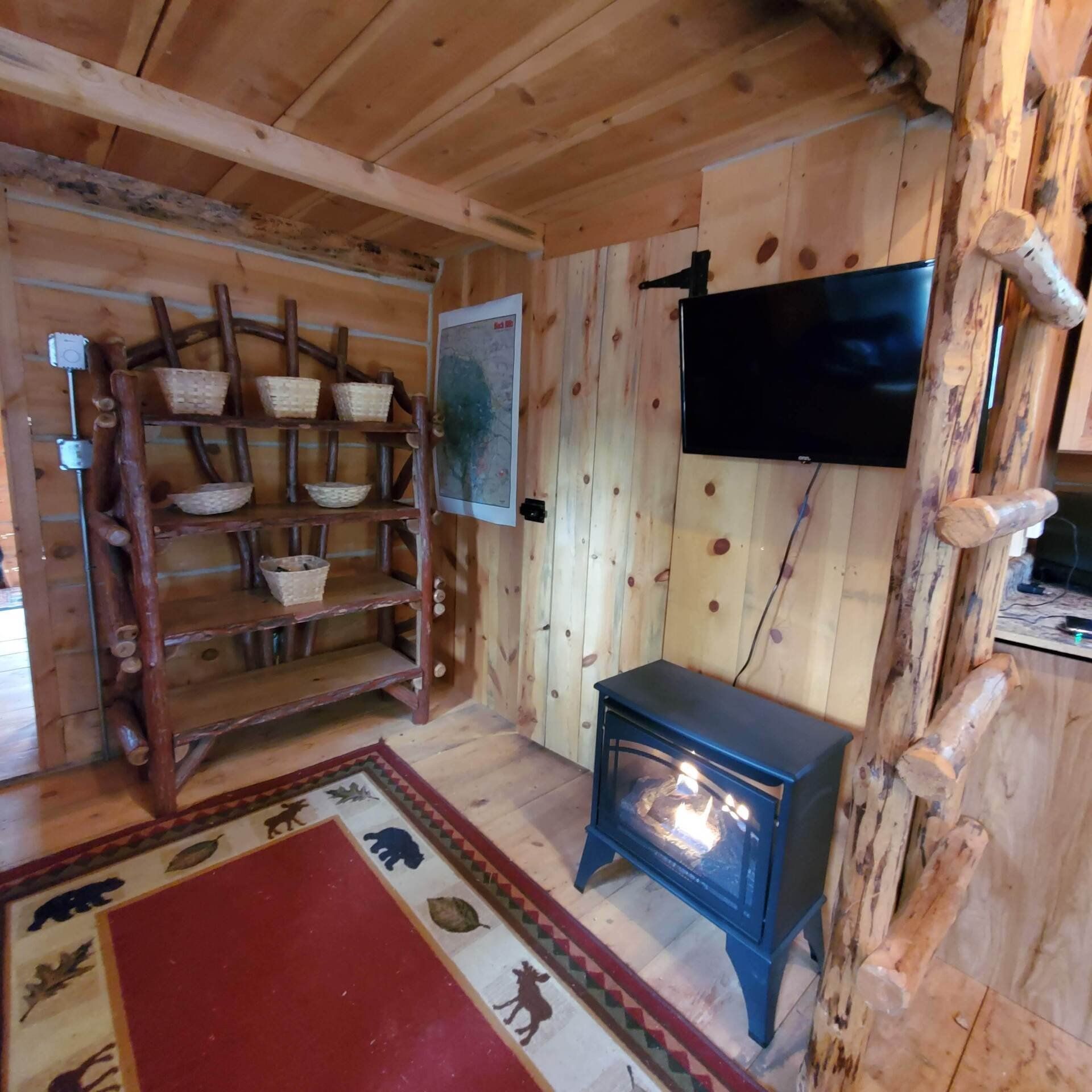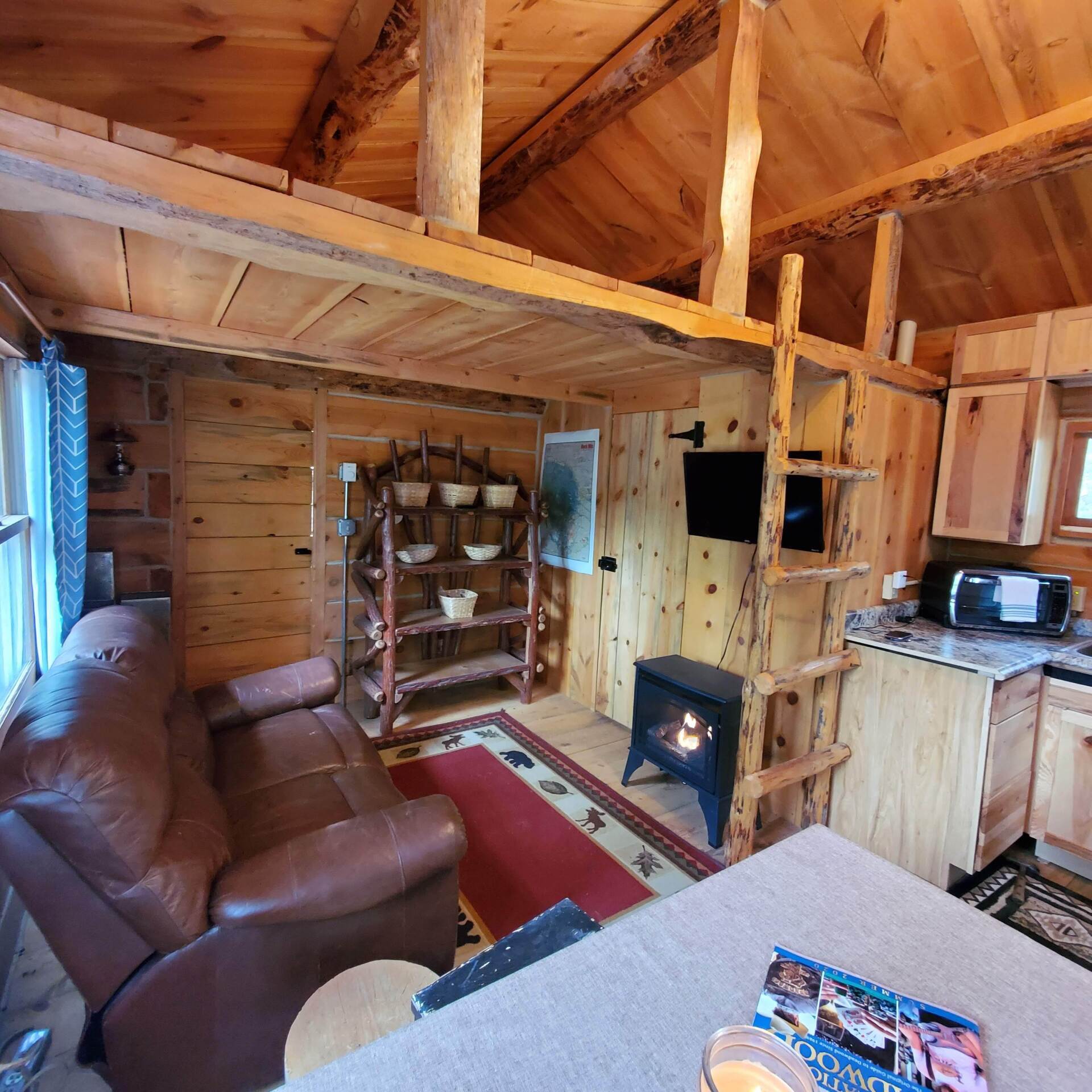 The living area features a love-seat recliner, streaming TV, and wifi, so you can stay connected, and a gas fireplace.